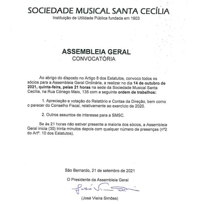 Ao abrigo do disposto no Artigo 8 dos Estatutos, convocam-se todos os sócios para a Assembleia Geral Ordinária, a realizar no dia 14 de outubro de 2021, quinta-feira, pelas 21 horas na sede da Sociedade Musical Santa Cecília.