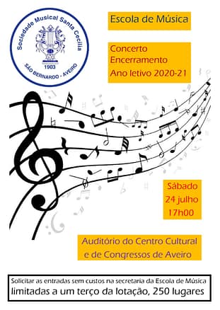 Realizou-se no sábado, dia 24 de Julho de 2021, pelas 17h00, no auditório do Centro de Congressos o Concerto de Encerramento do Ano Lectivo de 2020/2021 da Escola de Música da Sociedade Musical Santa Cecília, com a participação dos alunos e professores das vários instrumentos leccionados na Escola.