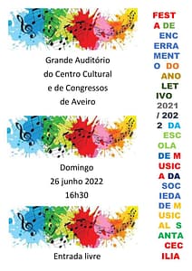 Realizou-se no domingo, dia 26 de Junho de 2022, pelas 16h30, no auditório do Centro Cultura e de Congressos de Aveiro o Concerto de Encerramento do Ano Lectivo de 2021/2022 da Escola de Música da Sociedade Musical Santa Cecília, com a participação dos alunos e professores das vários instrumentos leccionados na Escola com a apresentação a cargo de uma aluna da Escola de Teatro.